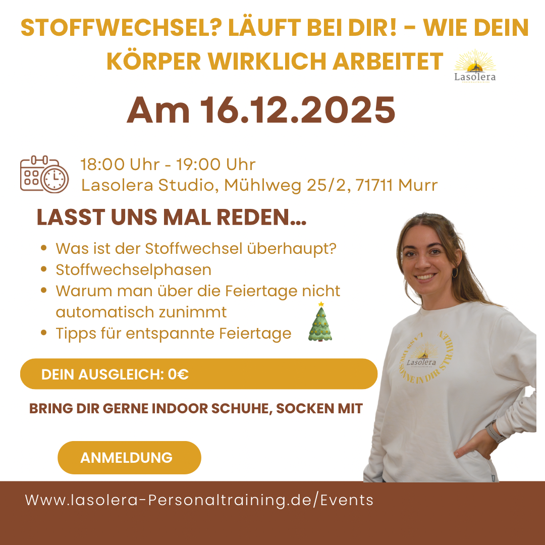 Weihnachten und die Feiertage stehen vor der Tür – doch bedeutet das automatisch, dass wir zunehmen? Nicht unbedingt! Bei unserem kostenlosen Mini-Workshop „Stoffwechsel? Läuft bei dir!“ lernst du, wie dein Körper wirklich arbeitet und wie du entspannt durch die Festtage kommst.